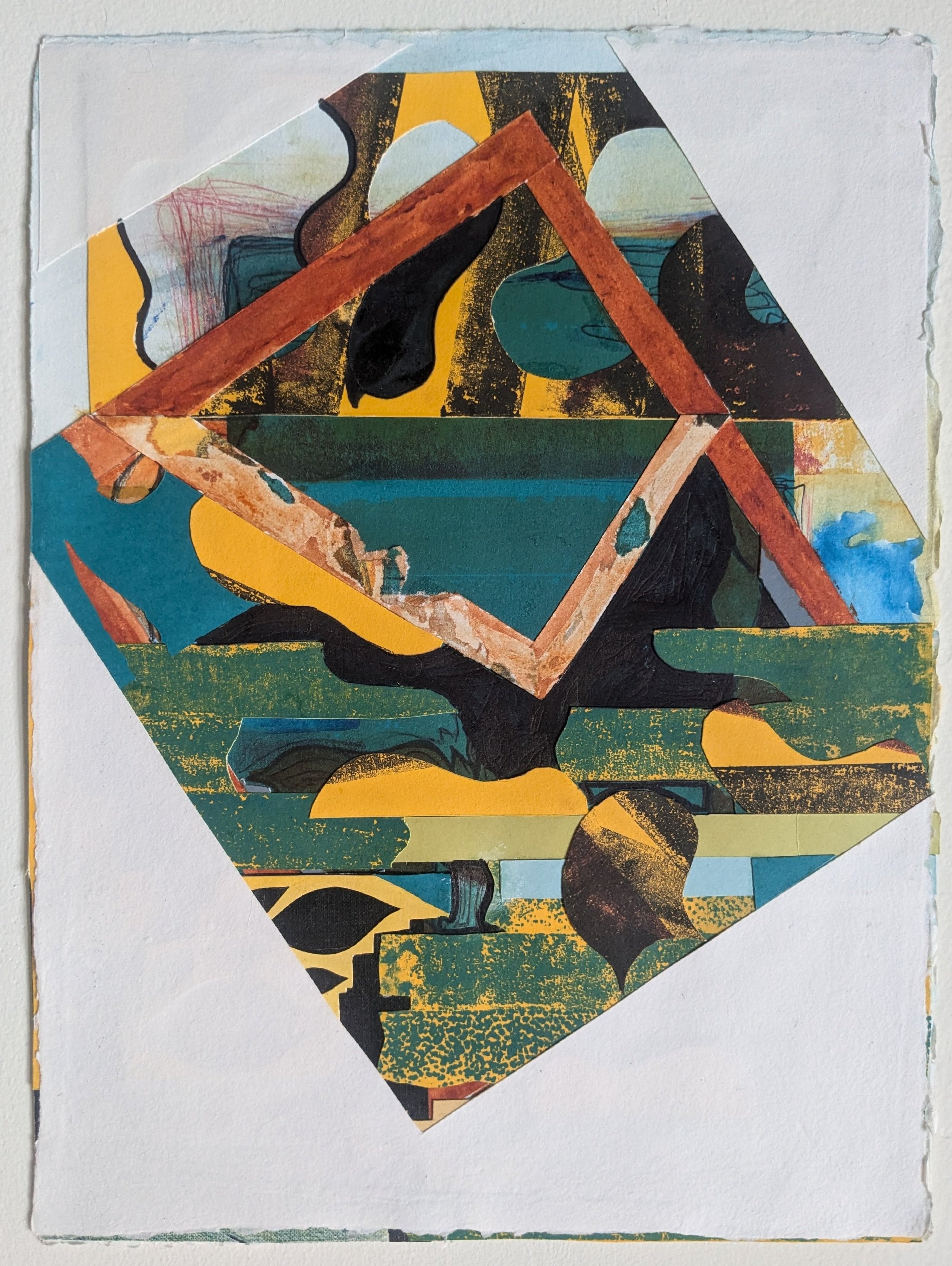 This collage was made in February, 2020, just before the COVID-19 lockdown. I composed it in one sitting of roughly eight hours, using fragments of my previous work to create a new composition. This piece is currently being featured in the annual national juried exhibition at the University of Mississippi, an exhibition called It’s Only (super)Natural. The exhibition’s theme, the boundary between the natural and the super-natural, has encouraged me to think deeply about this work and the circumstances of its creation. Though this piece is abstract, I am struck by the image of a horizon within it. This was not an image that I intended to create, but one that emerged organically as I played with the relationships between the shapes, textures, and colors present in pieces of paper I had worked with and collected over many years. After a period of searching, this work “clicked” all at once — the horizon emerged, and the work felt finished. The horizon in this work emerged as the natural horizon so often does when fog clears or when walking through dense trees. When I look back on February 2020, the horizon of my life was never more obscured. I could not have imagined what was in store for the world. The COVID-19 pandemic was a phenomenon of a scope beyond anything I, or most other people, had ever experienced. It felt almost super-natural in its immensity. As human and capitalism-driven climate change brought on the environmental factors that facilitated the spread of COVID-19, the pandemic was, indeed, beyond the natural. Through climate change, humans have become a supernatural force, changing the way nature functions in profound ways. Considering this work in context of this exhibition’s theme, where the natural meets the supernatural, allows the idea of shaping nature to come full circle in this work. As I shaped a horizon through paper, without knowing what the future would bring, so do we continue to shape our environments on massive, incomprehensible scales. As we aim understand the effects of these actions, and try desperately to mitigate them, we will not know what is on the horizon until it is upon us.